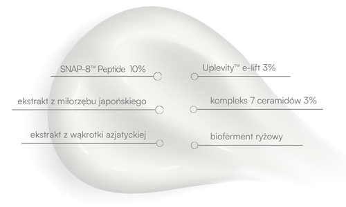 Dzięki 10 % SNAP-8™ Peptide skurcze mięśni mimicznych ulegają złagodzeniu, co przekłada się na wyraźne wygładzenie drobnych linii i zapobieganie powstawaniu nowych zmarszczek.