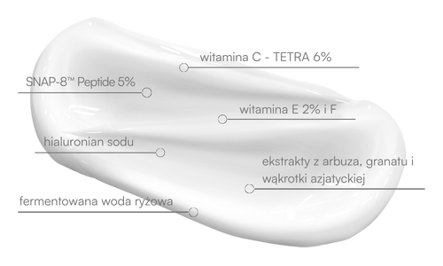 Neuropeptyd biomimetyczny SNAP-8™ Peptide blokuje drobne skurcze mięśni mimicznych, dzięki czemu zmarszczki stają się wyraźnie łagodniejsze. Synergiczne połączenie witamin C i E w skutecznych stężeniach zapewnia silne działanie antyoksydacyjne, które neutralizuje stres oksydacyjny – jeden z głównych czynników przyspieszających starzenie się skóry. Regularne stosowanie przeciwutleniaczy w codziennej pielęgnacji pomaga chronić komórki przed uszkodzeniami, wspierając zachowanie młodego, świeżego wyglądu cery.